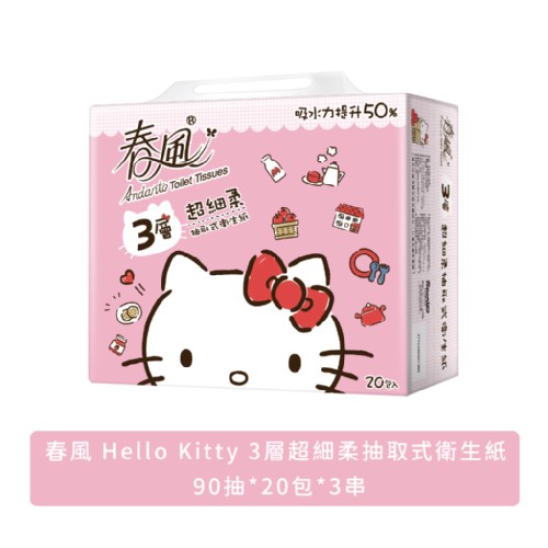 免運 【春風】Hello Kitty 3層超細柔抽取式衛生紙 90抽X20包X3串/箱