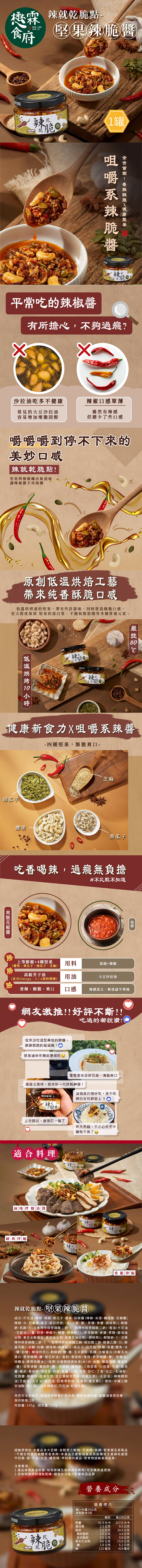 成分:芥花油、辣椒、蒜頭、葵花子、腰果、剁椒醬(辣椒、米酒、釀造醋、豆瓣醬(辣椒、水、豆瓣醬(黃豆(基因改造)、水、小麥、鹽)、蔗糖、食鹽、調味劑(L-麩酸鈉、乳酸、5'-次黃嘌呤核苷磷酸二鈉、5'-鳥嘌呤核苷磷酸二鈉)、香油(大豆油、芝麻油))、薑、蒜頭、檸檬汁、精鹽、健美鮮CL(麥芽糊精、食鹽、蔗糖、酵母抽取物、黃豆水解蛋白、香菇抽取物、高麗菜抽取物)、調味劑(L-麩酸鈉、5'-次黃嘌呤核苷磷酸二鈉、5'-鳥嘌呤核苷磷酸二鈉、琥珀酸二鈉、胺基乙酸、DL-胺基丙酸)、冰糖、砂糖、調味劑(檸檬酸))、南瓜子、白芝麻、砂糖、魚露(鰹魚、水、鹽、砂糖)、鮮味抄手(L-麩酸鈉、鹽、糖、玉米澱粉、乳糖、水解蛋白(水解玉米蛋白、麥芽糊精、鹽、葵花籽油)、香料、香菇粉(香菇、麥芽糊精、鹽)、棕櫚油(棕櫚油、硬質棕櫚油))、味霖(米麴醱酵調味液(水、米、米麴、釀造酒精、釀造酢、鹽)、甘蔗液糖、釀造酢、鹽)、花椒粉、調味粉(八角茴香、小茴香、花椒、高良薑、橘皮、黑胡椒、肉荳蔻、肉桂、乾薑、山楂、甘草、砂仁、丁香、白芷)、紅椒粉、玫瑰鹽、辣椒粉、抗氧化劑(混合濃縮生育醇(抗氧化劑)、大豆油)、辣椒調和油(芝麻油、大豆油、葵花油、紅椒萃取物、抗氧劑(維生素E)、香料、中鏈三酸甘油酯、丙二醇)、油性辣椒紅(芥花油、紅椒色素)