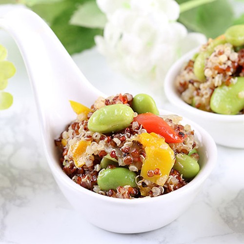 毛豆、藜麥、洋蔥、橄欖油、紅椒、黃椒、糖、鹽、黑胡椒粒
