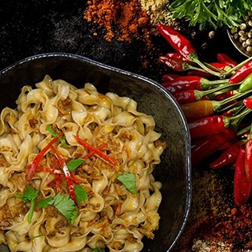 產品特色: 香濃的蔥油醬汁拌入寬厚紮實的麵體中,美麗的焦糖色映入眼簾