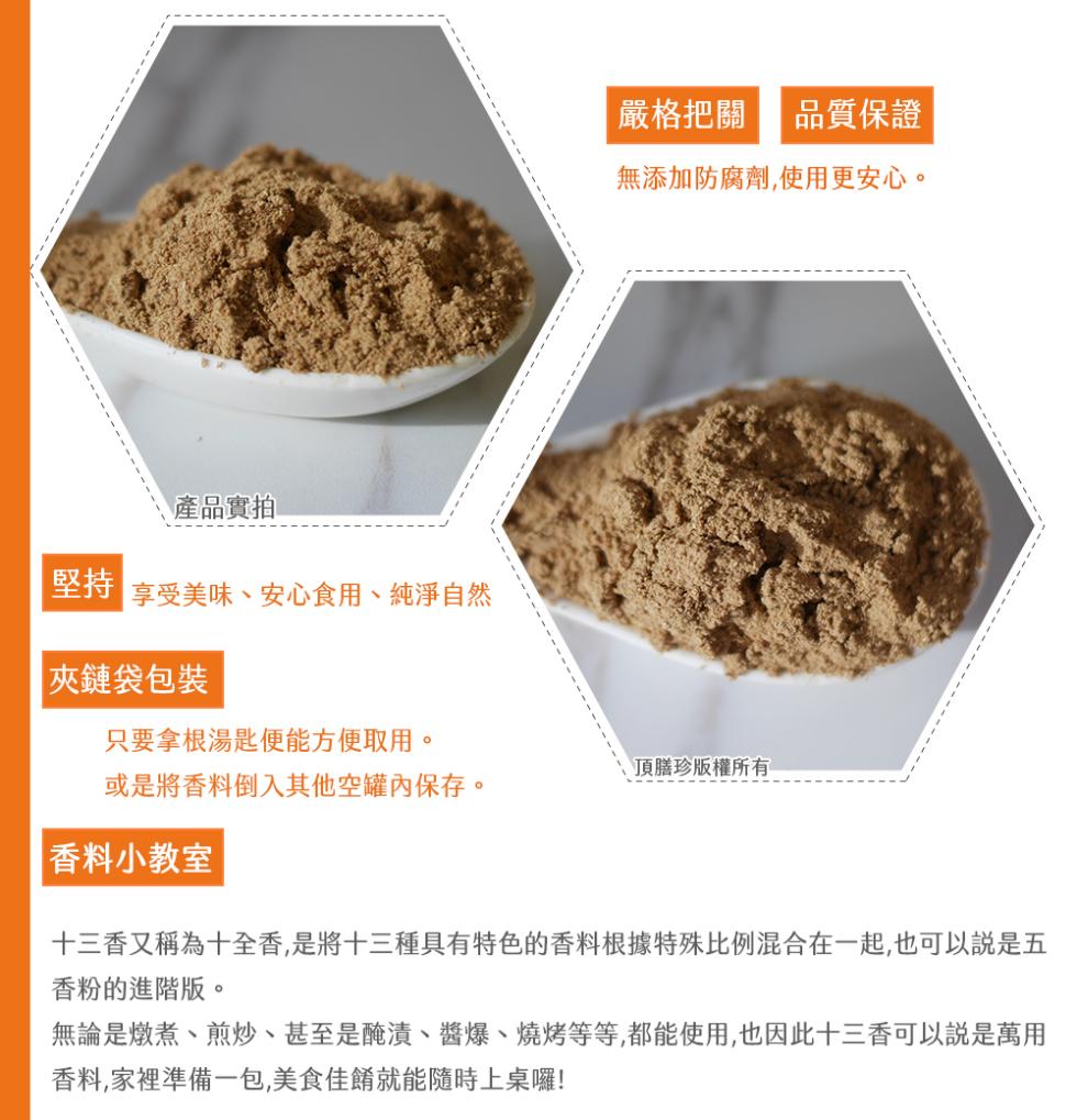 - 品項: 孜然風味香料粉 \ 紐澳良香料粉 \ 咖哩醬汁粉 \ 檸檬胡椒鹽 \ 芥末胡椒鹽 \ 椒香麻辣粉 \ 泰式香茅粉 \ 十三香調味粉