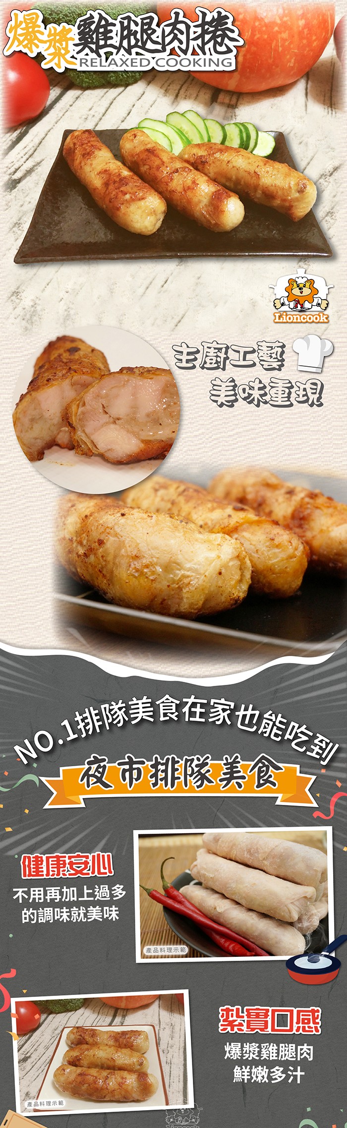 小秘訣:爆漿雞肉捲已經過調理,建議不要再加上過多的調味,料理完成後擠上檸檬汁或金桔汁食用,更具特殊風味~