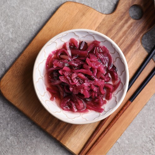 切絲蘿蔔,以紫蘇梅汁、鹽、糖與香料層層交疊。美味在時間之流深沉發酵,甦醒成嵐山楓紅的典麗。馨香酸甜,清脆爽口,素華地展露深厚無盡的層次,讓伴隨米飯、麵食,挑起燎原的驚豔!