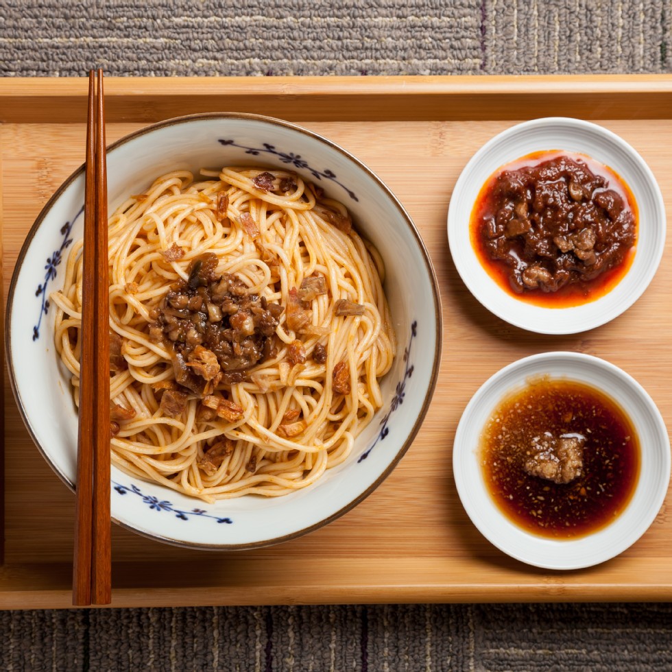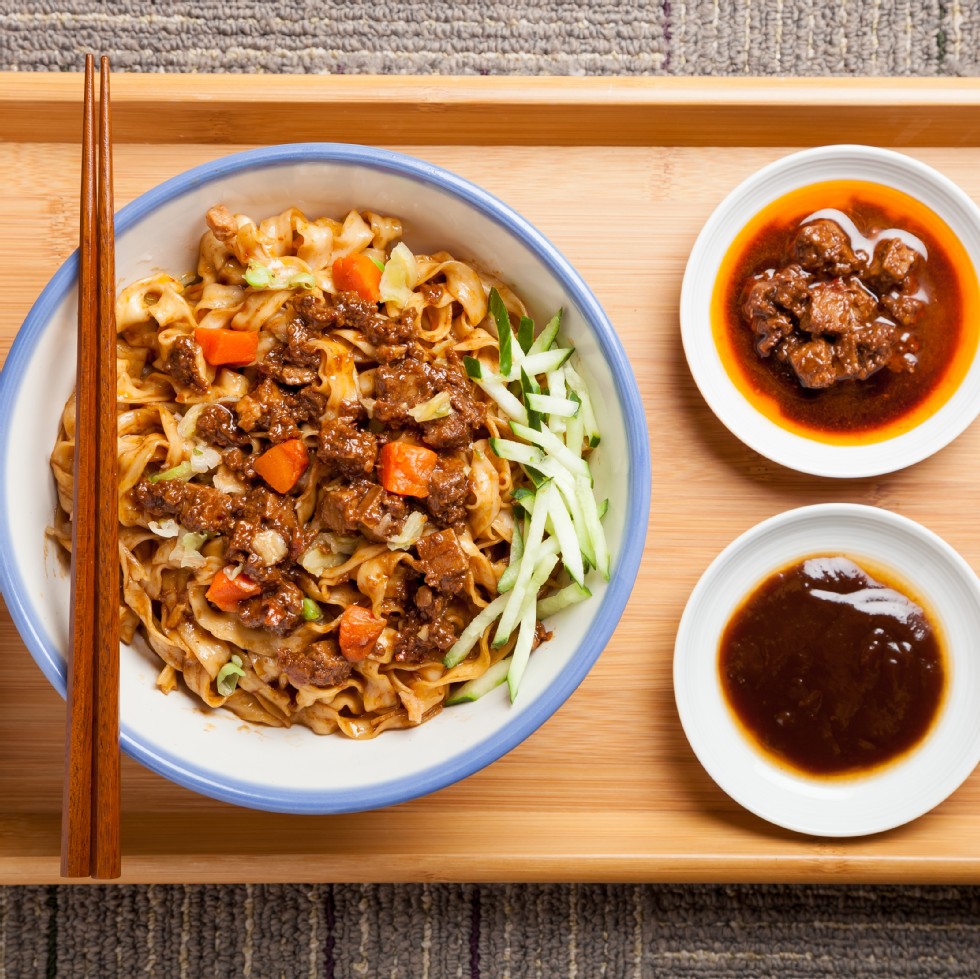 ● 100%黄豆古法制作的甜面酱與數十種配料拌炒,製作而成的香濃炸醬。
