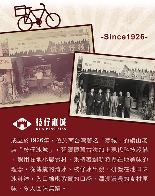 成立於1926年,位於南台灣著名「蕉城」的旗山老店「枝仔冰城」,延續傳統古法加上科技或自動設備生產出在地台灣精神的冰品,除了傳統的清冰、枝仔冰、近年更發展出以台灣在地食材的冰淇淋,綿密紮實的口感,濃濃的食材味道,展現出台灣在地精神。