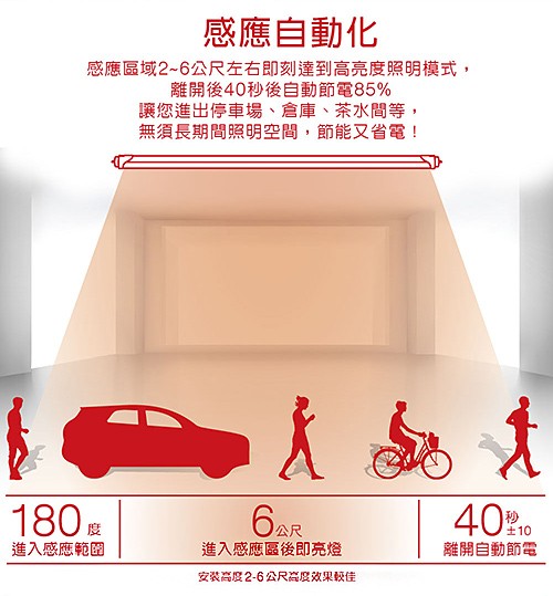3.更智慧:感應區域2~6公尺左右即刻達到高亮度照明模式,人車離開後40秒自動關閉,讓您進出停車場/倉庫/茶水間等無須長期間照明空間,節能又省電