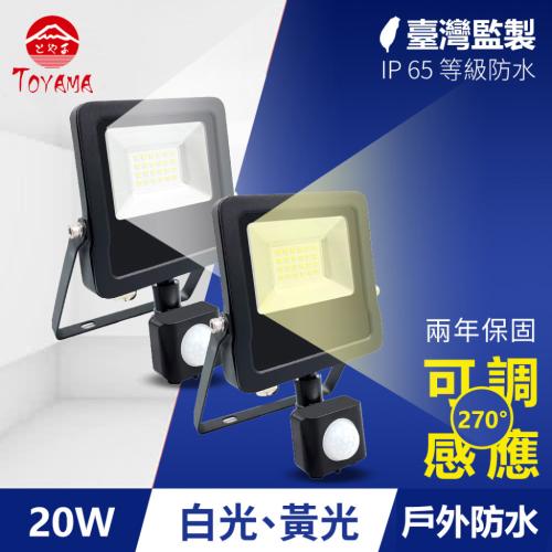 可設定白天或夜晚感應亮燈,感應距離可調約2~8 公尺,感應時間可調10秒~7分鐘,20W光通量2200Lm,耗電少且感應角度廣約180度左右各90度,