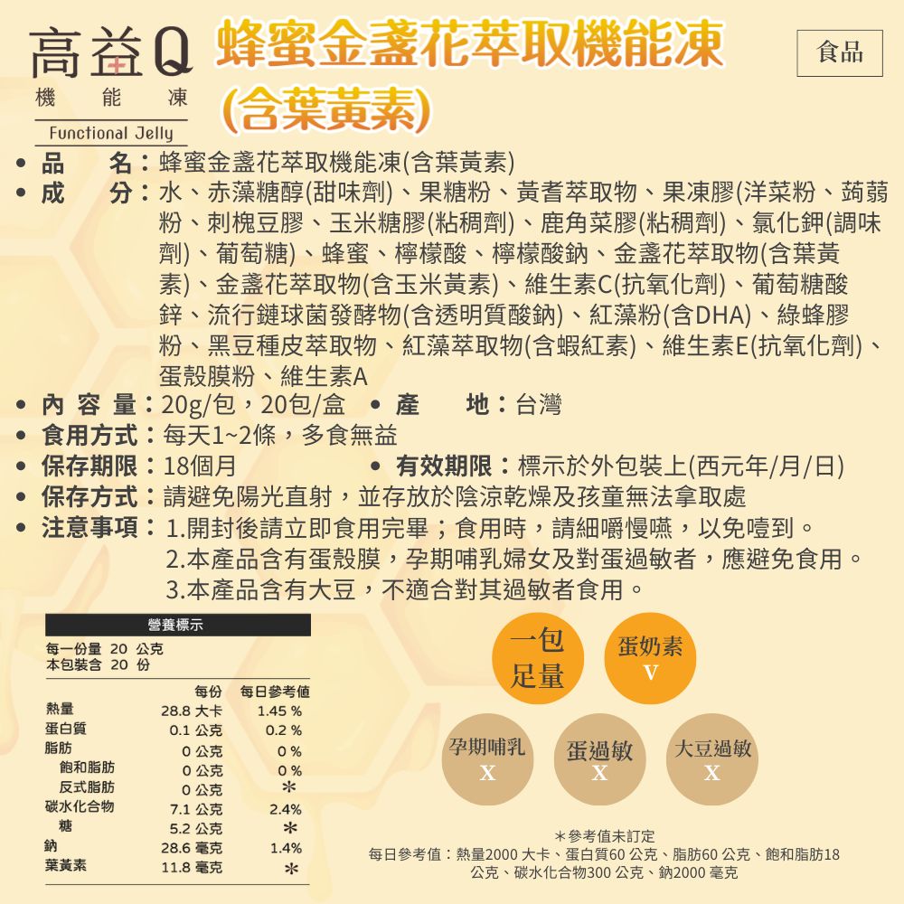 ◉成分:水、赤藻糖醇(甜味劑)、果糖粉、黃耆萃取物、果凍膠(洋菜粉、蒟蒻粉、刺槐豆膠、玉米糖膠(粘稠劑)、鹿角菜膠(粘稠劑)、氯化鉀(調味劑)、葡萄糖)、蜂蜜、檸檬酸、檸檬酸鈉、金盞花萃取物(含葉黃素)、金盞花萃取物(含玉米黃素)、維生素C(抗氧化劑)、葡萄糖酸鋅、流行鏈球菌發酵物(含透明質酸鈉)、紅藻粉(含DHA)、綠蜂膠粉、黑豆種皮萃取物、紅藻萃取物(含蝦紅素)、維生素E(抗氧化劑)、蛋殼膜粉、維生素A