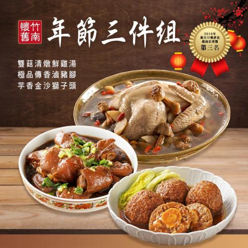 免運 【竹南懷舊】年菜三件組(雙菇清燉鮮雞湯+極品傳香滷豬腳+芋香金沙獅子頭)
