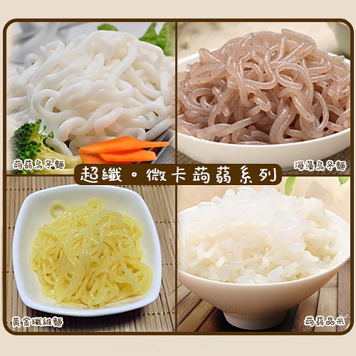 - 品項: 蒟蒻晶米 \ 蒟蒻麵-烏冬麵 \ 蒟蒻麵-海藻烏冬麵 \ 蒟蒻麵-黃金纖維麵