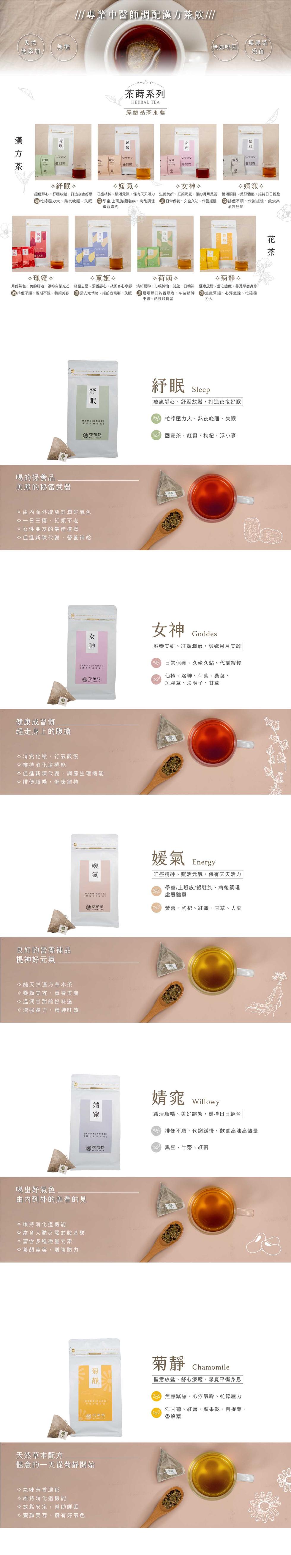 - 品項: 女神 12入(仙楂洛神茶)*5 \ 媛氣12入(人蔘茶)*5 \ 紓眠12入(國寶紅棗茶)*5 \ 婧窕12入(黑豆牛蒡茶)*5 \ 瑰蜜12入(玫瑰金盞茶)*5 \ 荷萌12入(薄荷菊花茶)*5 \ 菊靜12入(蘋果洋甘菊茶)*5 \ 薰姬12入(香蜂薰衣草茶)*5 \ 龜苓茶12入*5 \ 日常調理組-媛氣12入+瑰蜜12入+婧窕12入+荷萌12入+龜苓茶12入 \ 安心養神組-紓眠12入+媛氣12入+薰姬12入+菊靜12入+瑰蜜12入 \ 朝氣滿盈組-荷萌12入+婧窕12入+菊靜12入+媛氣12入+龜苓茶12入 \ 調息漢方茶組-紓眠12入+媛氣12入+婧窕12入+女神12入+龜苓茶12入 \ 療心花草茶組-瑰蜜12入+薰姬12入+菊靜12入+荷萌12入+龜苓茶12入