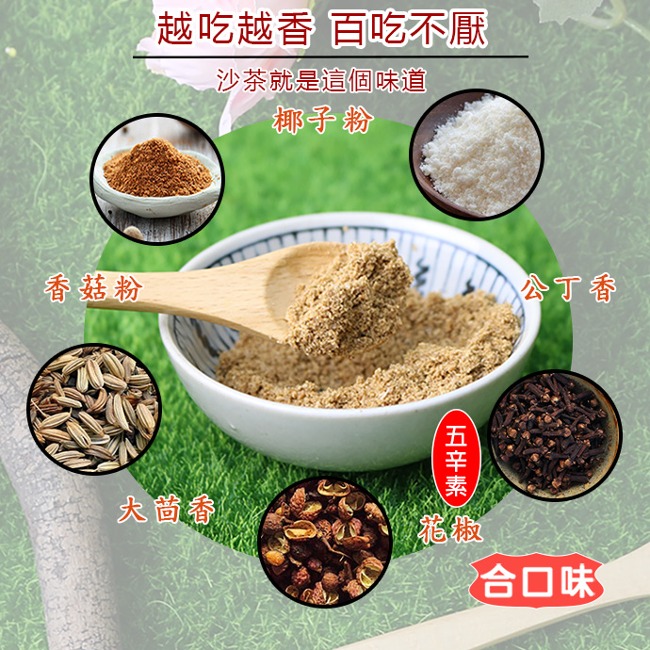 合口味沙茶粉嚴選食材,健康且精心調製,讓沙茶香的夠味辣的克制,不論用來烹煮沙茶火鍋、沙茶炒牛肉、沙茶炒芹菜花枝…等各種台式口味家常菜,或是炒飯、拌麵等,皆是美味動人,回味無窮,絕對讓人脾胃大開!