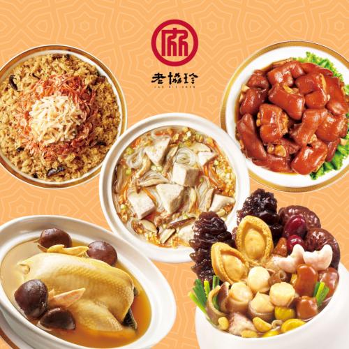 冰糖豬腳,芋頭炊粉鍋,鮑魚干貝佛跳牆,櫻花蝦干貝飯,酥炸金鯧魚,數量有限,售完為止/,年菜組,火烔雞湯。鮑魚干貝佛跳牆,榮獲蘋果日報佛跳牆評比第一!嚴選南非鮑魚、黑玉烏參、北海道干貝等山珍海味,煲以特製高湯,道地美味好評不斷。火烔雞湯,嚴選上等老母雞、台灣香菇、金華火腿,遵循古法費時燉煮,湯頭濃郁香醇,肉質鮮甜軟嫩,年菜盛宴必備佳餚!。櫻花蝦干貝飯,老協珍與太子油飯跨界合作,以香菇等爆香入味,拌入招牌油飯,並舖上東港櫻花蝦及特選北海道干貝絲,豐富層次鮮美口感,令人吮指回味!冰糖豬腳,精選在地優質豬腳,獨門滷汁燉煮3小時至入味,加入特製冰糖醬汁,燉煮出焦糖色澤,豐富Q彈層次、鹹甜香醇芋頭炊粉鍋,嚴選大甲芋頭融入私房特調高湯,清甜回甘,經典台菜佳餚,為餐桌上不可或缺的好味道。酥炸金鯧魚,外皮金黃酥脆,一咬鮮甜多汁,肉質鮮嫩滑爽,是幸福年宴的精髓所在。