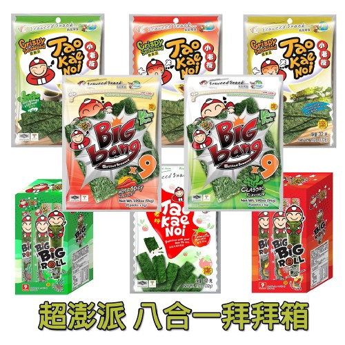 厚片海苔原味、辣香味、山葵味及原味各1包/超級大海苔原味、辣味各1包/海苔棒棒捲原味、辣味各1盒