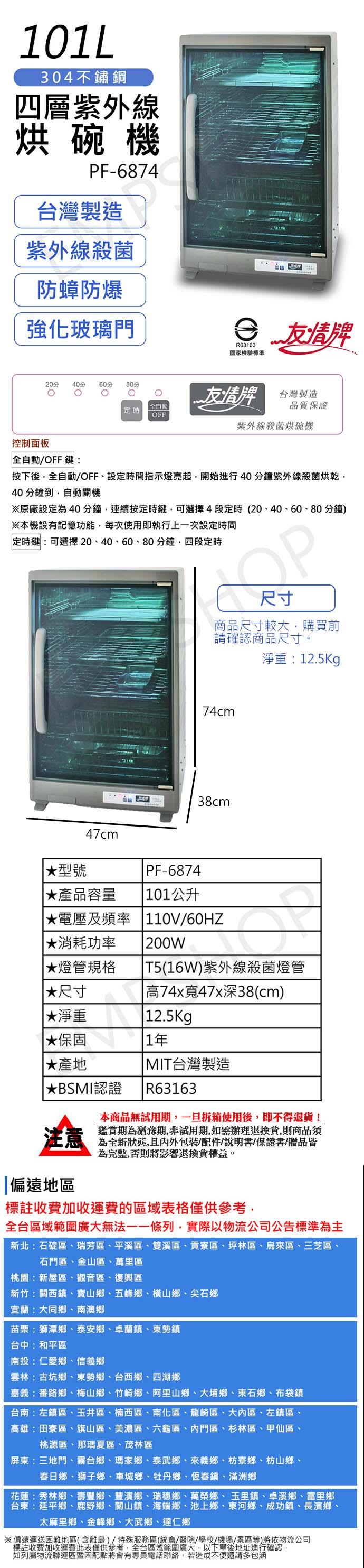 免運 【友情牌】101L四層全不鏽鋼紫外線烘碗機 PF-6874