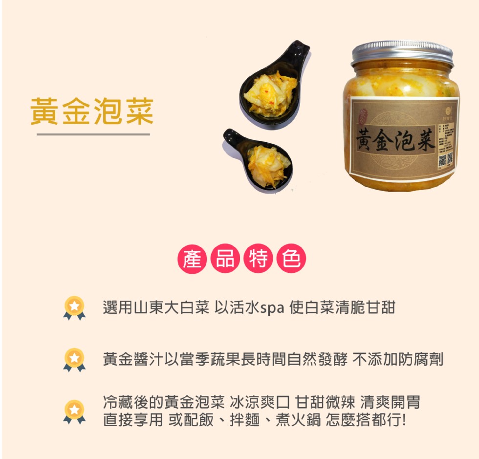 《好饗吃黃金泡菜》 使用當季蔬果長時間發酵,跟市面上一般黃金泡菜完全不同,吃過一次就會愛上他。家中冰箱常備,用來炒肉、炒菜、煮湯、煮粥各種搭配方式都行!