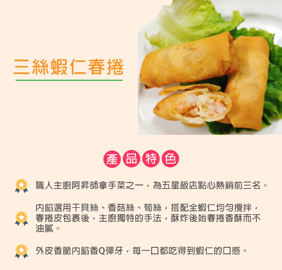 📜成分:春捲皮、蝦仁、干貝絲、香菇絲、筍絲、韭黃、白表粒