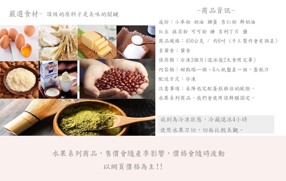 本店其他商品 查看全部 法藍四季-金沙布列塔尼酥餅 原價$180 $90 法藍四季-酥脆珍珠糖小泡芙 $90 法式栗子蒙布朗法式甜點塔-6吋 $580 售出36份 京都乳酪法式甜點塔-6吋 $380 售出57份 美國核桃72%巧克力法式甜點塔-6吋 $580 售出18份 芋泥法式甜點塔-6吋 原價$450 $380 售出199份 72%生巧克力甜點塔 原價$450 $380 售出17份 加拿大楓糖捲 原價$400 $250 售出133份 黃金輕乳酪蛋糕捲 原價$450 $280 售出72份 抹茶紅豆蛋糕捲 原價$450 $280 售出15份 蔓越莓蛋糕捲 原價$450 $280 售出10份 日式純黑巧克力蛋糕捲 原價$400 $280 售出123份 法藍四季-誘惑70%生巧蛋糕 原價$450 $380 售出6份 芋頭肉鬆起酥三明治 $350 售出1份 全麥素火腿起酥三明治(蛋奶素) $280 招牌肉鬆火腿起酥三明治 原價$350 $280 售出3份 藍莓起酥三明治 $230 切達三重奏起士三明治 $350 售出1份 燻雞火腿起酥三明治 $300 售出5份 夏威夷起士起酥三明治 $280
