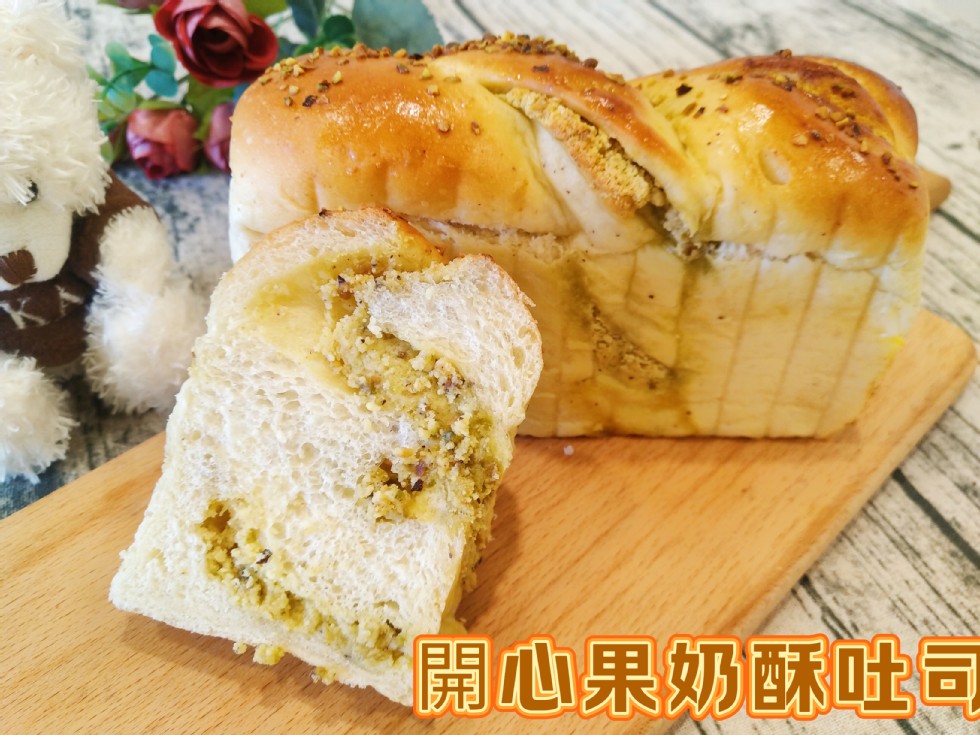 美國西西里開心果醬麵糰,再搭配特製開心果奶酥撒上開心果碎,開心果香氣很迷人