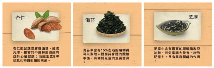 最近的一項研究發現,於日常飲食中加入杏仁零嘴,將能提升對某些重要營養素的攝取,進而提升整體的飲食品質,且無論使用烘培、生的或加奶油的杏仁,都會減低LDL膽固醇,對健康都有很大的益處!杏仁豆脂肪含量多,但富含的高纖維會讓脂肪被人體吸收的量減少、讓人有飽足感,所以只要量控制得宜,杏仁很適合當點心!我們將杏仁搭配含多種維生素的海苔,以傳統精工烘培方式烤得酥脆,並添加海藻鈣,不僅健康無負擔也是相當美味的零嘴。