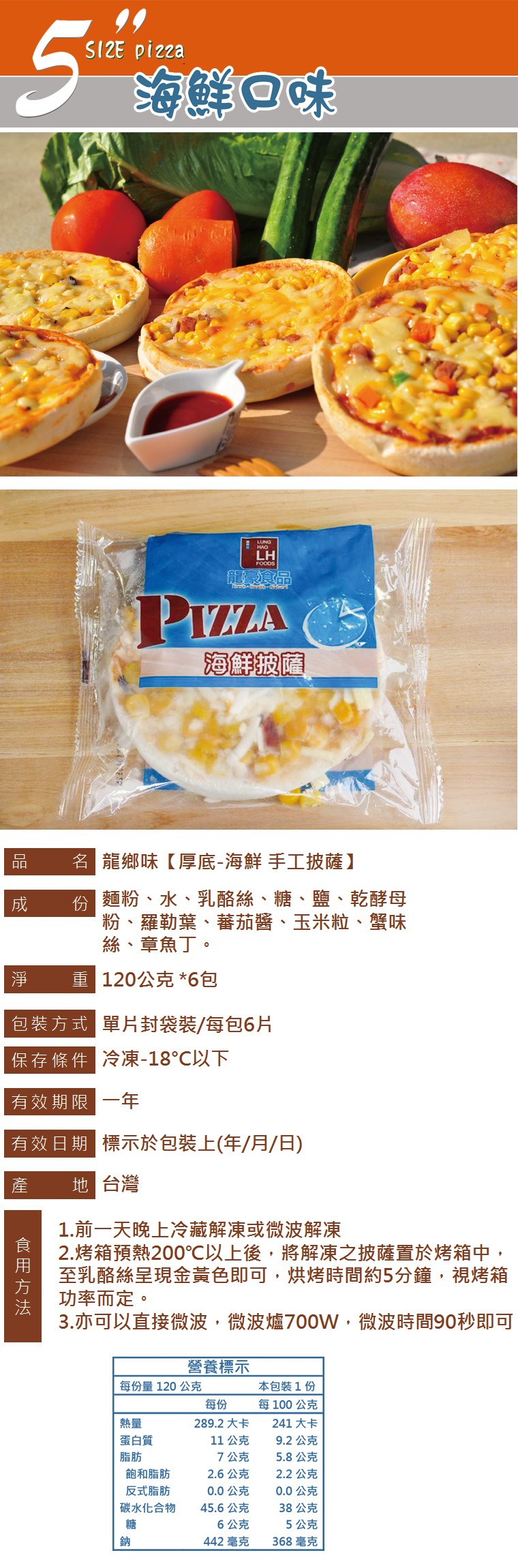 【龍豪食品-龍鄉味】銅板美食~厚片5吋海鮮 PIZZA(6入) 120公克*6包 優惠 $180 買氣8人 分享 : 加入購物車 數量 優惠$180 滿2000元免付運費180元 離島不限金額固定收取運費400元