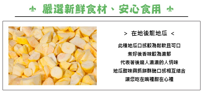 成 份:粉心麵粉、水、新鮮地瓜、大豆沙拉油、植物油、花生油、香草粉、芝麻、糖、鹽、高鮮味素