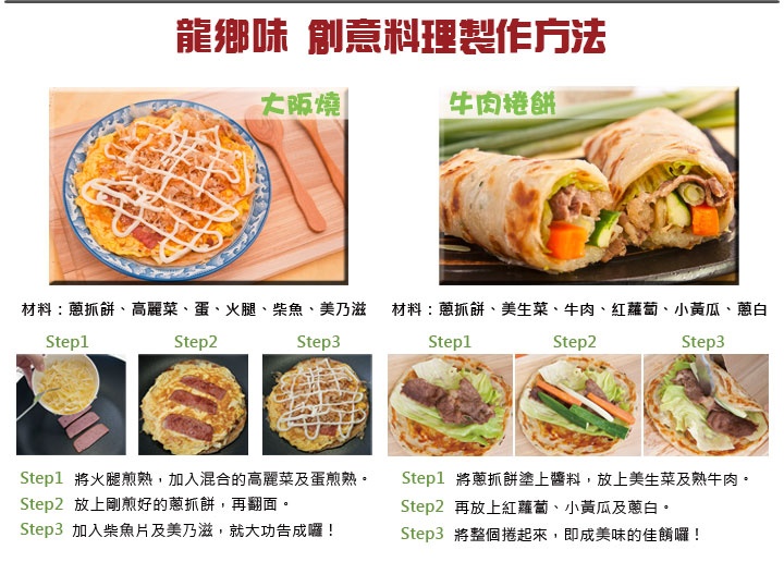 • 食用方法:鍋內放入少許的油,待油鍋熱後放入蔥抓餅(不需解凍)將餅皮翻動數次至餅皮有膨鬆即呈現金黃色,即可享用另搭配玉米、火腿、鮪魚、培根,蔬菜、起士真是人間美味