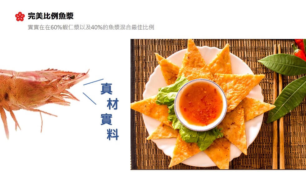 【成 份】: 蝦仁、花枝、魚漿、春捲皮、胡椒粉、鹽