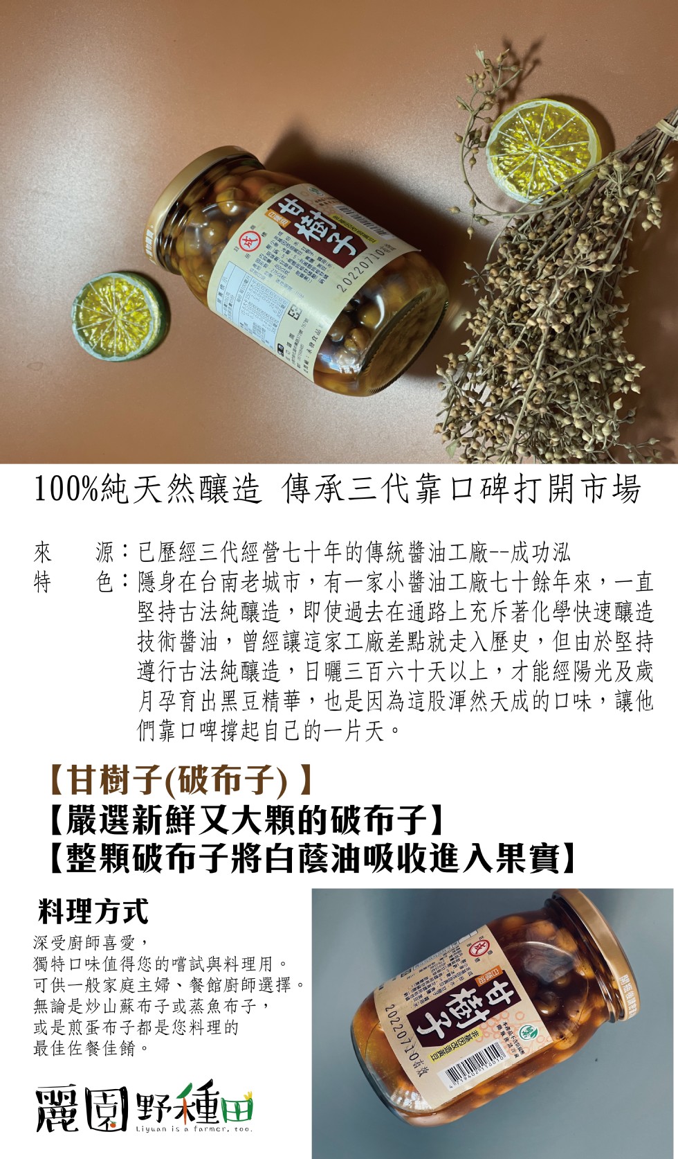 【均以嚴選新鮮又大顆的破布子為主,整顆破布子能將白蔭油吸收進入果實,口感更加甘甜飽滿且不咬嘴。】