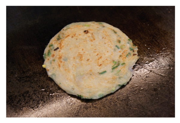 ◎步驟4 用鍋鏟轉動蔥油餅並用筷子擠壓撥鬆蔥油餅讓其鬆開