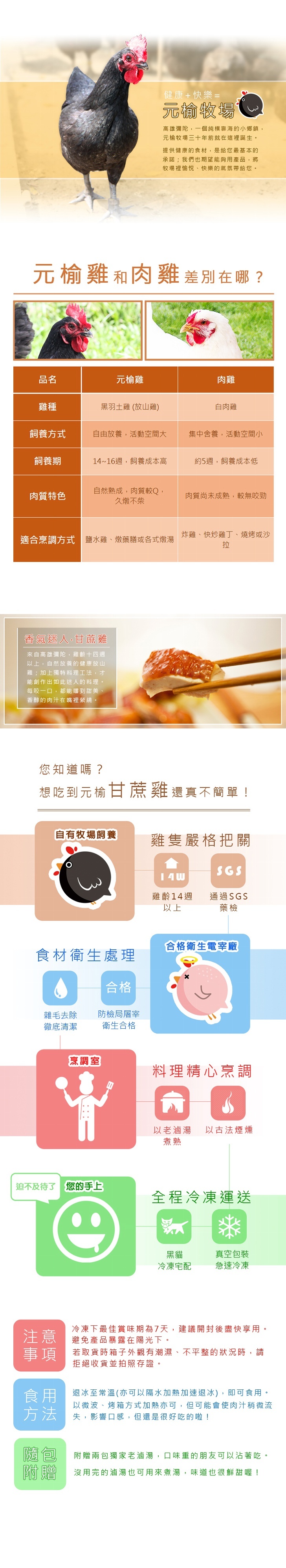 本店其他商品 查看全部 【元榆牧場】自然放牧黑羽雞 - 安全無毒雞胸 原價$180 $150 【元榆牧場】黑羽放山土雞 - 安全無毒雞腿單隻 - 去骨 - 原價$330 $280 【元榆牧場】黑羽放山土雞 - 安全無毒雞腿單隻 - 切塊 - 原價$310 $260 【元榆牧場】黑羽放山土雞 - 去骨醉雞腿捲 - 300g $380 【元榆牧場】黑羽放山土雞 - 鮮嫩鹽水雞 - 去頭切塊750g大包裝- 適合三至四人 $325 【元榆牧場】黑羽放山土雞 - 安全無毒雞腿單隻 - 全腿 - 原價$310 $260