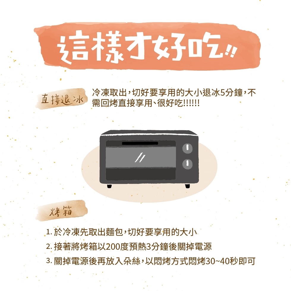 冷凍取出 切好要享用的大小退冰5分鐘(不需回烤) 直接享用 很好吃!!!!!!