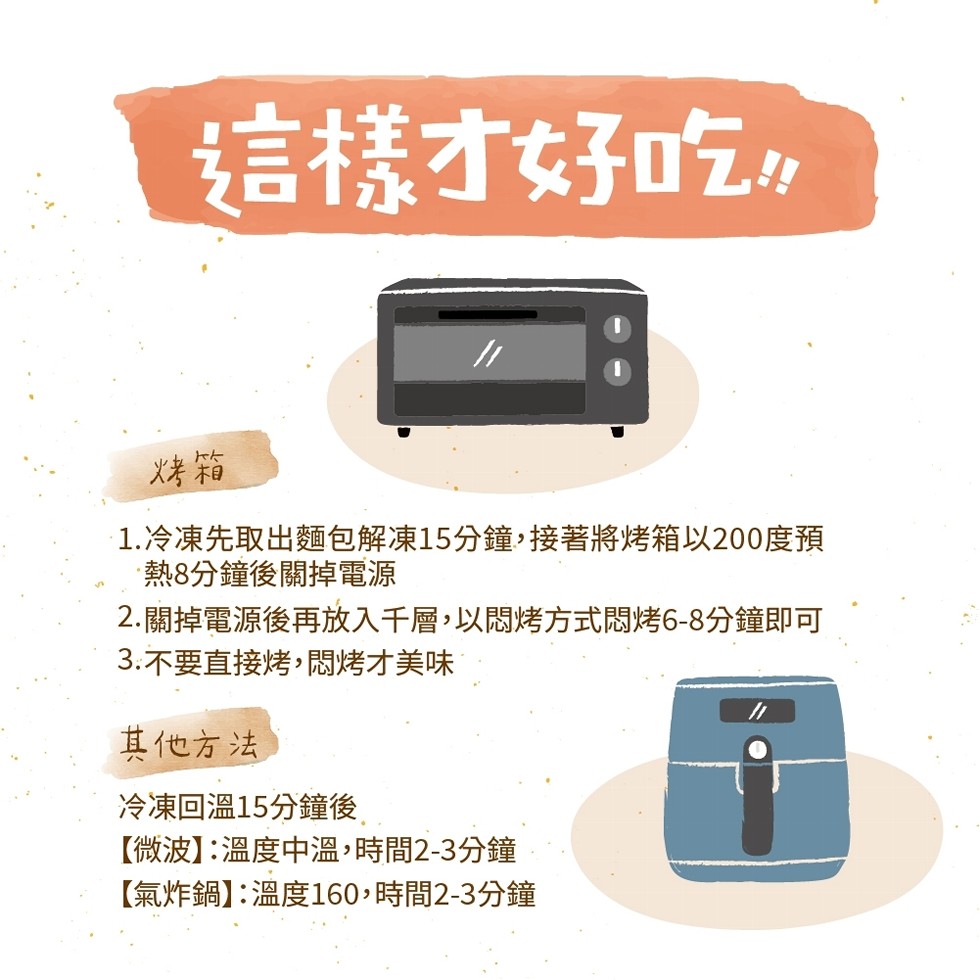【微波】:溫度中溫,時間2-3分鐘 【氣炸鍋】:溫度160,時間2-3分鐘