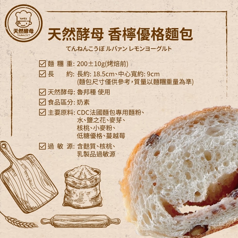 ✅主要原料:CDC法國麵包專用麵粉、 水、鹽之花、麥芽、核桃、小麥粉、低糖優格、蔓越莓。