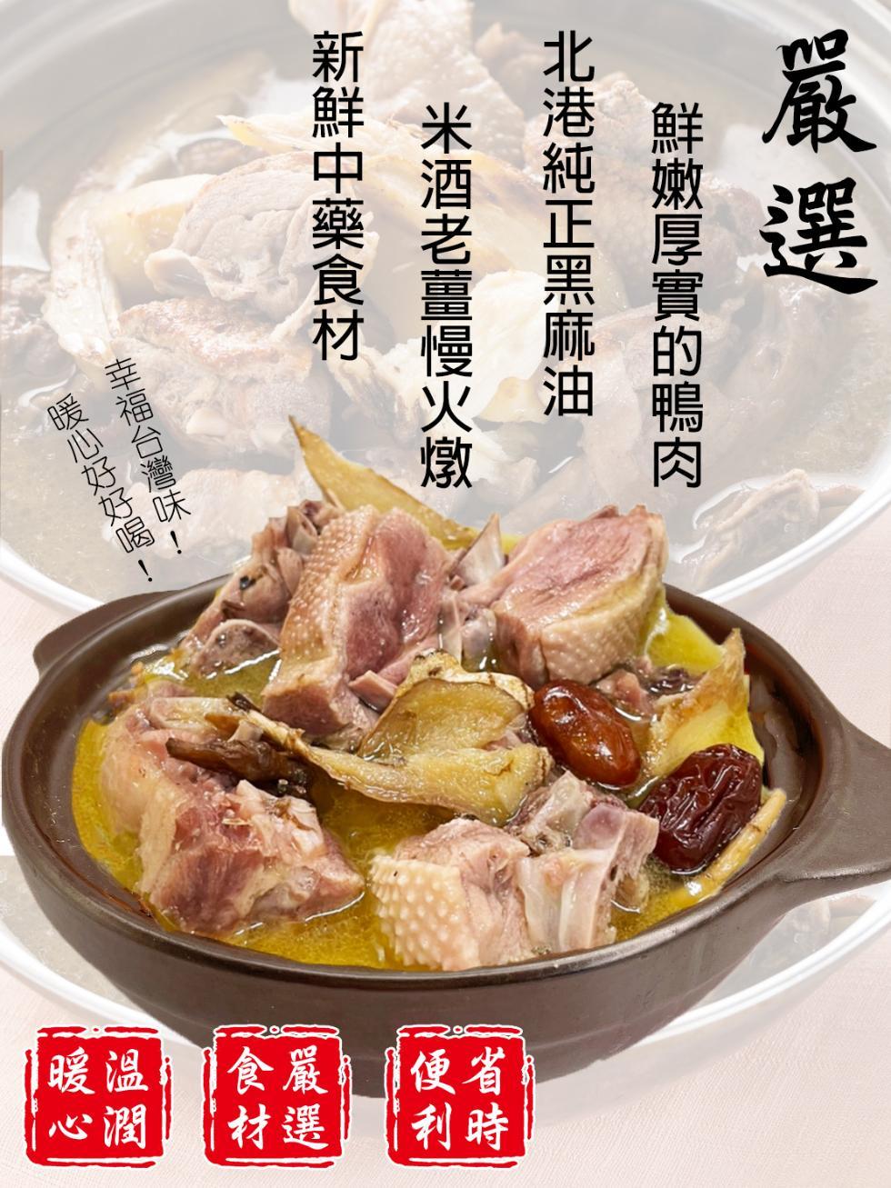 •成 份:水、台灣鴨肉、薑片、枸杞、紅棗、當歸、鹽、麻油、料理米酒
