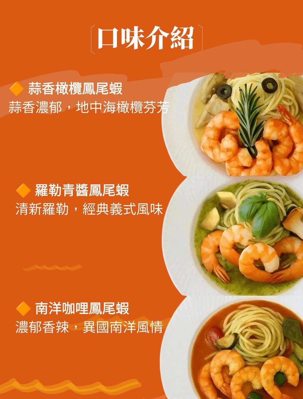 商品說明 產品名稱:蒜香橄欖鳳尾蝦規 格:125g±5%/入保存期限:-18℃冷凍保存180天(以消費者收受日算起,至少距有效期限剩餘總效期的2/3以上)成 份:白蝦、杏鮑菇、大豆沙拉油、蒜仁、橄欖粕油、料理白酒、黑胡椒、紅辣椒粉(辣椒)、鹽、歐芹商品特色:嚴選飽滿鳳尾蝦,佐以蒜香與橄欖油醬汁,鮮甜爽口、香氣逼人,簡單加熱即可享受異國風味的海味饗宴。 注意事項:本商品不含麵