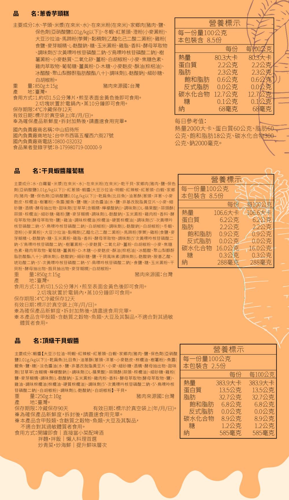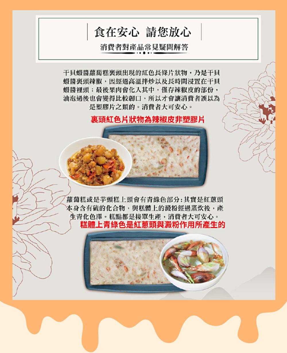 成 份:水、白蘿蔔、米漿(在來米、水)、在來米粉(在來米)、乾干貝、家鄉肉(豬肉、鹽、保色劑(亞硝酸鹽0.01g/kg以下))、紅蔥頭、蝦醬(大豆沙拉油、明蝦、紅辣椒、紅蔥頭、白蝦、家鄉肉(豬肉、鹽、保色劑(亞硝酸鹽0.01g/kg以下))、乾扁魚(比目魚)、油蔥酥(蔥頭、洋蔥、小麥麩皮、棕櫚油、樹薯粉)、魚露(鯷魚、鹽、糖)、淡色醬油(水、鹽、非基改脫脂黃豆片、小麥、細砂糖、酒精、酵母抽出物、甜味劑(甘草萃(含糊精、檸檬酸鈉))、調味劑(DL-蘋果酸)、蒜頭酥(蒜頭、棕櫚油)、細砂糖、雞粉(鹽、麥芽糊精、調味劑(L-麩酸鈉)、玉米澱粉、雞肉粉、香料、酵母萃取物(酵母萃取物、鹽)、雞油、調味棕櫚油(棕櫚油、硬質棕櫚油)、調味劑(5'-次黃嘌吟核苷磷酸二鈉、5'-鳥嘌呤核苷磷酸二鈉)、白胡椒粉)、調味劑(L-麩酸鈉)、白胡椒粉)、冬蝦、澄粉(小麥澱粉)、大豆沙拉油、黏稠劑(乙醯化己二酸二澱粉)、馬蹄粉(荸薺)、雞粉(食鹽、麥芽糊精、L-麩酸鈉、糖、玉米澱粉、雞脂、香料、酵母萃取物、調味劑(5'次黃嘌呤核苷磷酸二鈉、5'鳥嘌呤核苷磷酸二鈉)、樹薯澱粉、小麥麩質、二氧化矽、薑粉、白胡椒粉、小麥、焦糖色素、雞肉萃取物、葡萄糖、薑黃粉、D-木糖、小麥麩皮、酥油(棕梠油)、冰醋酸、聚山梨醇酐脂肪酸酯八十)、調味劑(L-麩酸鈉)、細砂糖、鹽、干貝風味素(調味劑(L-麩酸鈉、胺基乙酸、琥珀酸二鈉、5'-次黃嘌呤核苷磷酸二鈉、5'-鳥嘌呤核苷磷酸二鈉)、食鹽、糖、玉米澱粉、干貝粉、酵母抽出物、扇貝抽出物、麥芽糊精)、白胡椒粉。