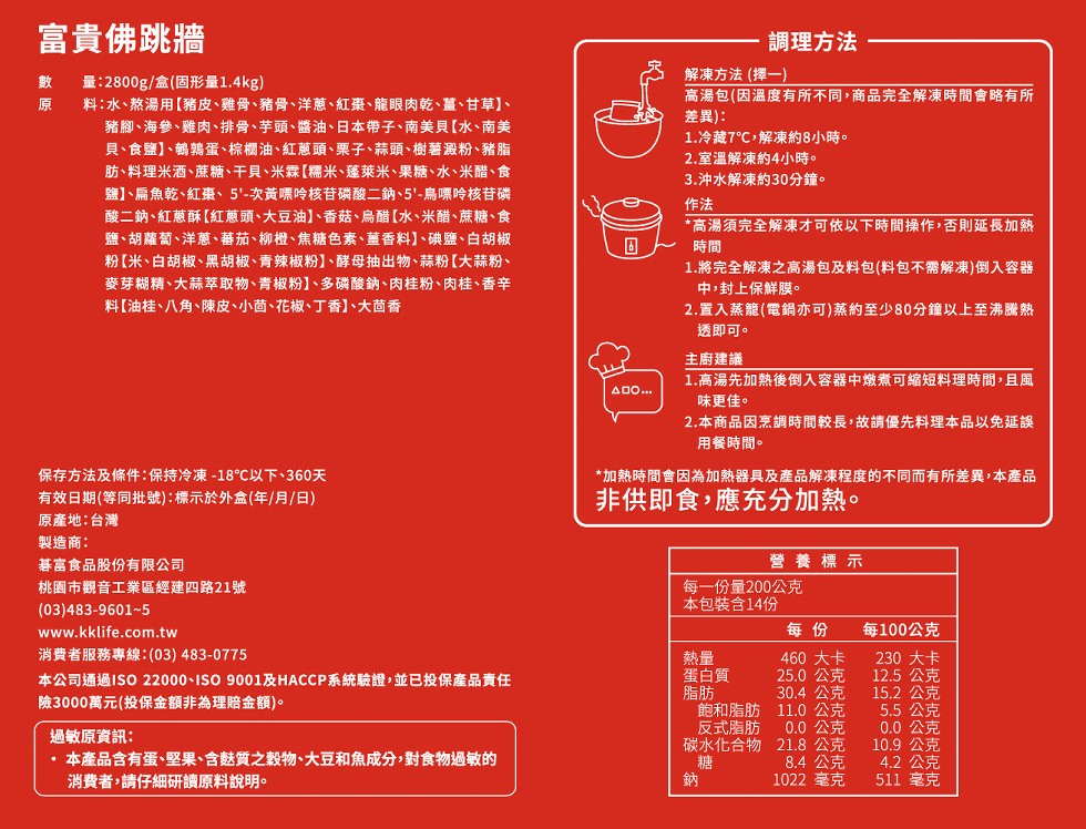 成 份:水、熬湯用【豬皮、雞骨、豬骨、洋蔥、紅棗、龍眼肉乾、薑、甘草】、豬腳、海參、雞肉、排骨、芋頭、醬油、日本帶子、南美貝【水、南美貝、食鹽】、鵪鶉蛋、棕櫚油、紅蔥頭、栗子、蒜頭、樹薯澱粉、豬脂肪、料理米酒、蔗糖、干貝、米霖【糯米、蓬萊米、果糖、水、米醋、食鹽】、扁魚乾、紅棗、 5'-次黃嘌呤核苷磷酸二鈉、5'-鳥嘌呤核苷磷酸二鈉、紅蔥酥【紅蔥頭、大豆油】、香菇、烏醋【水、米醋、蔗糖、食鹽、胡蘿蔔、洋蔥、蕃茄、柳橙、焦糖色素、薑香料】、碘鹽、白胡椒粉【米、白胡椒、黑胡椒、青辣椒粉】、酵母抽出物、蒜粉【大蒜粉、麥芽糊精、大蒜萃取物、青椒粉】、多磷酸鈉、肉桂粉、肉桂、香辛料【油桂、八角、陳皮、小茴、花椒、丁香】