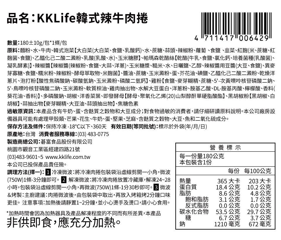 商品說明 ◆產品名稱:【KKLife】韓式辣牛肉捲◆規 格:180g/條◆製造日期:依產品外包裝所示◆保存期限:360天◆成 份:依頁面圖片所示◆過敏原資訊:依頁面圖片所示牛肉來源:澳洲、紐西蘭◆產品特色:依頁面圖片所示