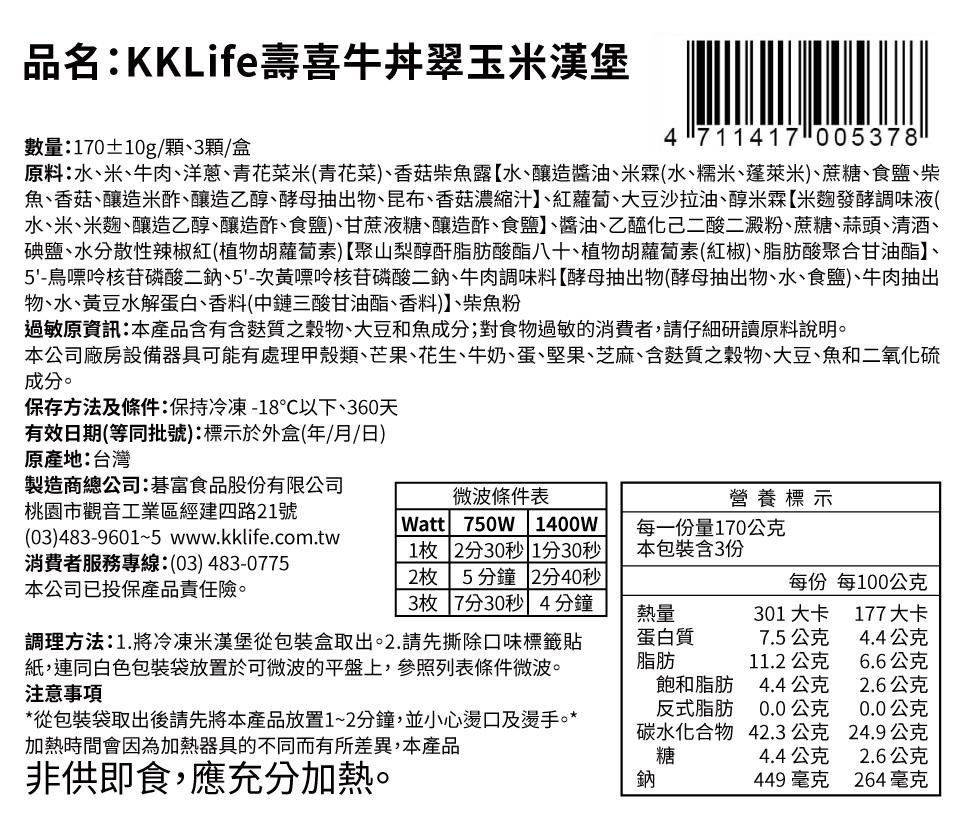商品說明 ◆產品名稱:【KKLife】壽喜牛丼翠玉米漢堡◆規 格:170g/顆; 3顆/盒◆製造日期:依產品外包裝所示◆保存期限:360天◆成 份:依頁面圖片所示◆過敏原資訊:依頁面圖片所示◆產品特色:滑嫩細緻的雪花牛肉片,搭配新鮮洋蔥熬煮出的牛丼汁,香氣沾染彈性黏糯恰好的米飯,濃郁四溢口中,在家也能做出日式料理亭的好味道。