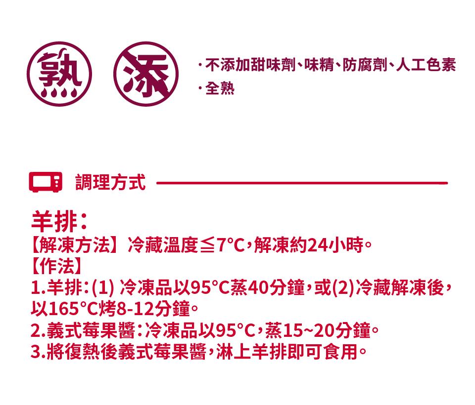 商品說明 ◆產品名稱:【KKLife】義式莓果醬烤羔羊肩排◆規 格:310±40g(羊排230±30g、醬包80±10g(固形量8±4g)/盒)◆製造日期:依產品外包裝所示◆保存期限:360天◆成 份:依頁面圖片所示◆過敏原資訊:依頁面圖片所示