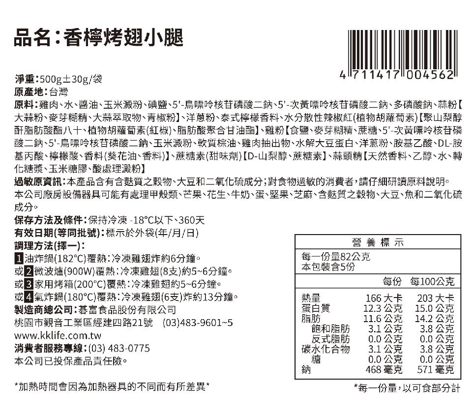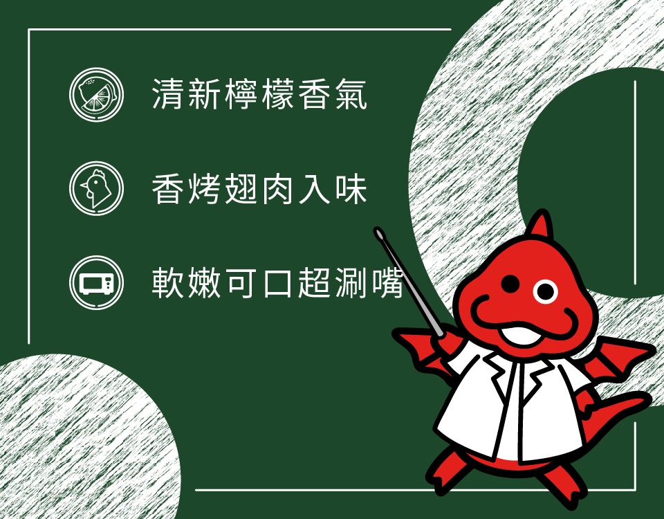 商品說明 ◆產品名稱:【紅龍】香檸烤翅小腿◆規 格:500g/袋◆製造日期:依產品外包裝所示◆保存期限:360天◆成 份:依頁面圖片所示◆過敏原資訊:依頁面圖片所示◆產品特色:清新檸檬香氣,香烤翅肉入味,加熱即食超方便泰式檸檬風味,香酥多汁、吮指回味!