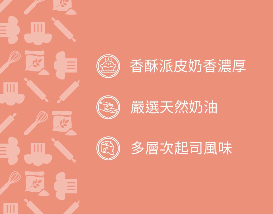 選用紐西蘭天然奶油製成的香酥派皮,帶有自然的奶油香氣