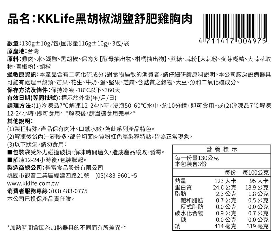 商品說明 ◆產品名稱:【KKLife】黑胡椒湖鹽舒肥雞胸肉◆規 格:130g/包;3包/袋◆製造日期:依產品外包裝所示◆保存期限:360天◆成 份:依頁面圖片所示◆過敏原資訊:依頁面圖片所示◆產品特色:雞胸肉質水嫩無人工添加物風味淡雅清爽解凍即食