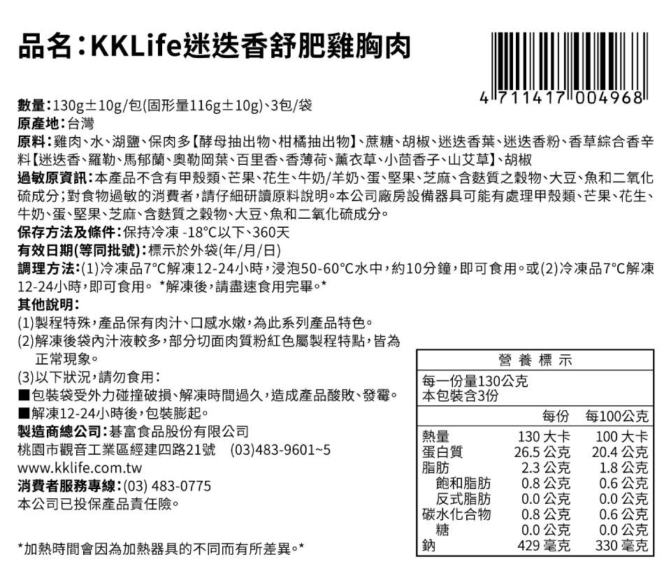 商品說明 ◆產品名稱:【KKLife】迷迭香舒肥雞胸肉◆規 格:130g/包;3包/袋◆製造日期:依產品外包裝所示◆保存期限:360天◆成 份:依頁面圖片所示◆過敏原資訊:依頁面圖片所示◆產品特色:雞胸肉質水嫩無人工添加物風味淡雅清爽解凍即食