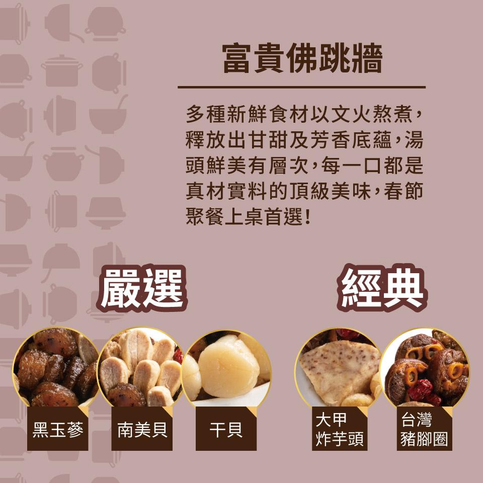 早鳥價【KKLife】富貴佛跳牆 2800g/盒(固形量1400g) 原價$2500 優惠 $1350 分享 : 紅利回饋1% 滿額免運 加入購物車 數量 原價$2500 優惠$1350 滿2500元免付運費220元