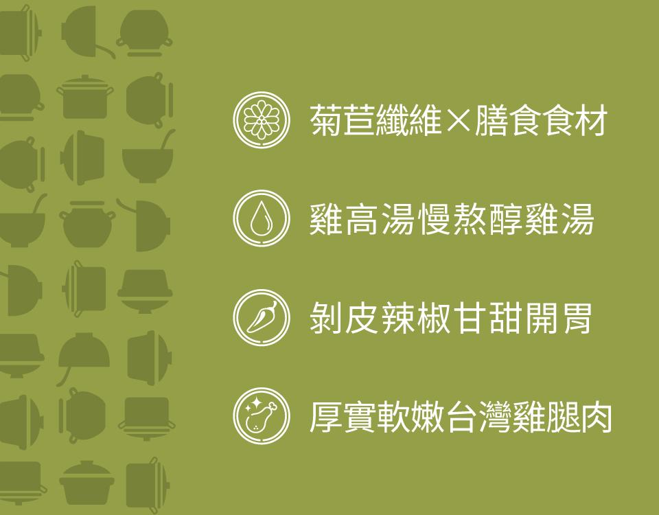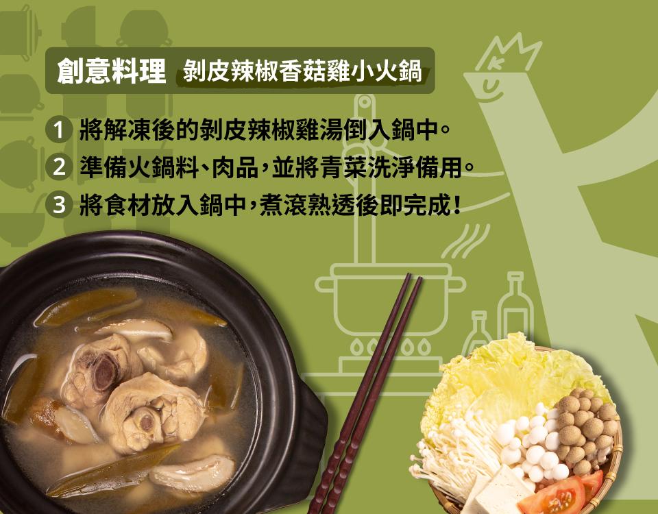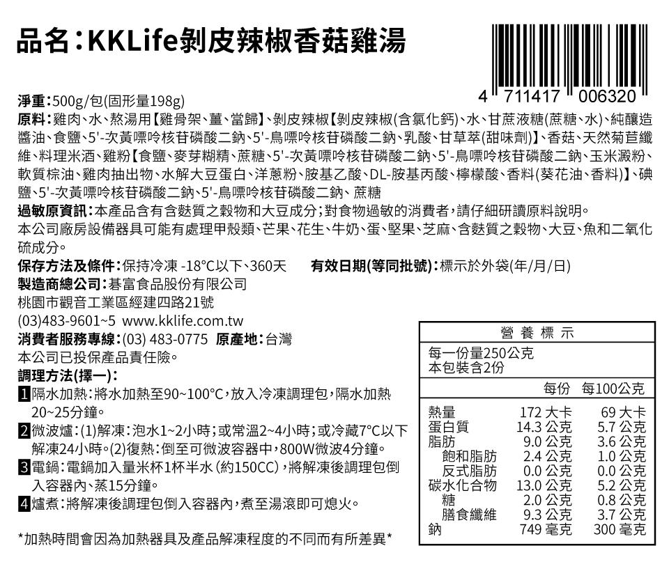 【KKLife】剝皮辣椒香菇雞湯 500g/包(固形量198g) 原價$450 優惠 $159 分享 : 紅利回饋1% 滿額免運 加入購物車 數量 原價$450 優惠$159 滿2500元免付運費220元