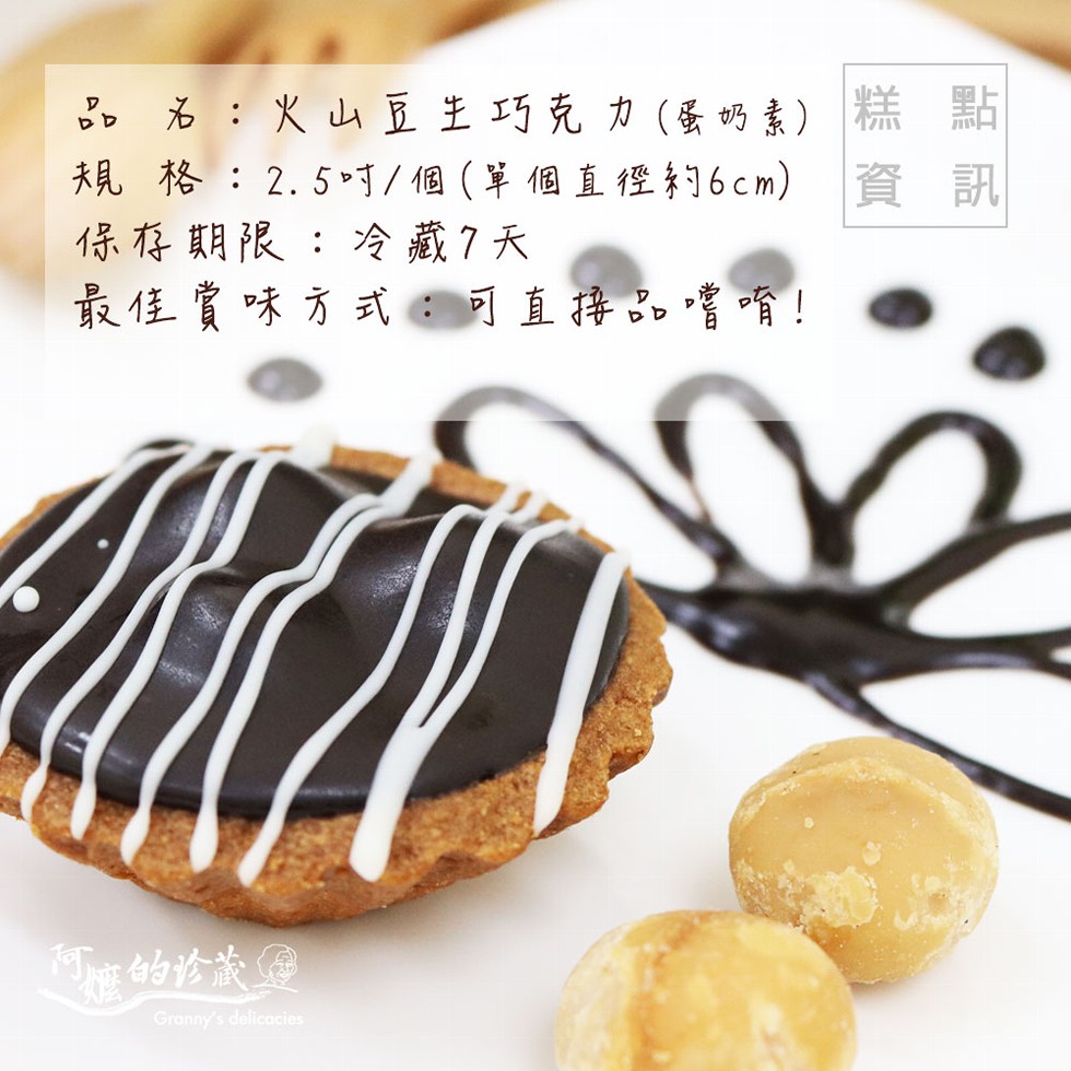 商品說明 產品名稱:火山豆生巧克力塔(單顆)規 格:30g±9%/入製造日期:接單後生產保存期限:需冷藏於2-4°C以下一週成 份:黑巧克力、夏威夷豆、鮮奶油、奶油、麵粉、蛋、奶粉、糖產品特色:嚴選進口頂級夏威夷豆的與比利時72%濃郁黑巧克力合奏出多層次口感,塔皮100%純手工製作保證酥、脆、鬆!夏威夷豆經過獨門技術烘烤,保留完整豆香,唇齒留香!