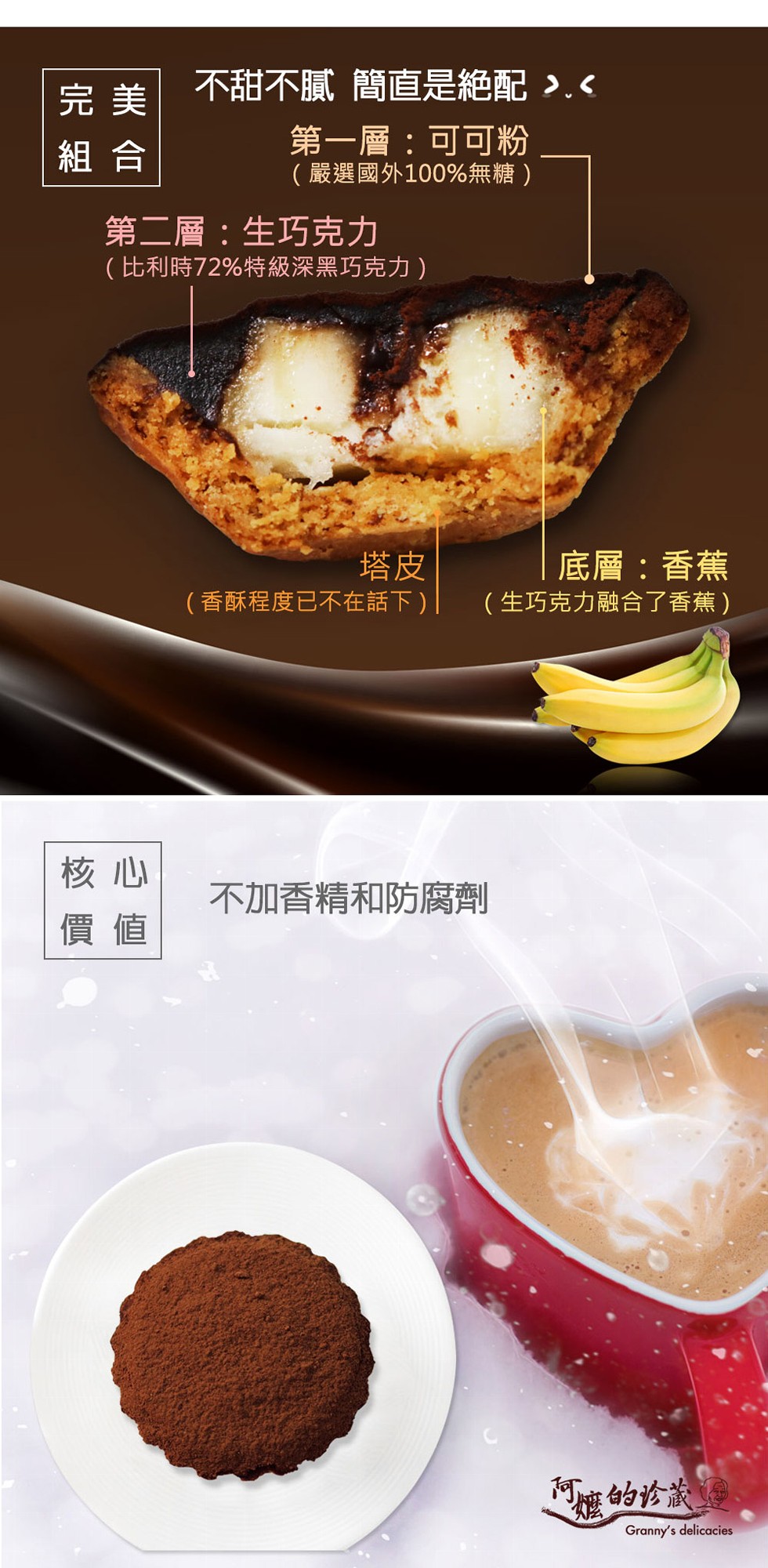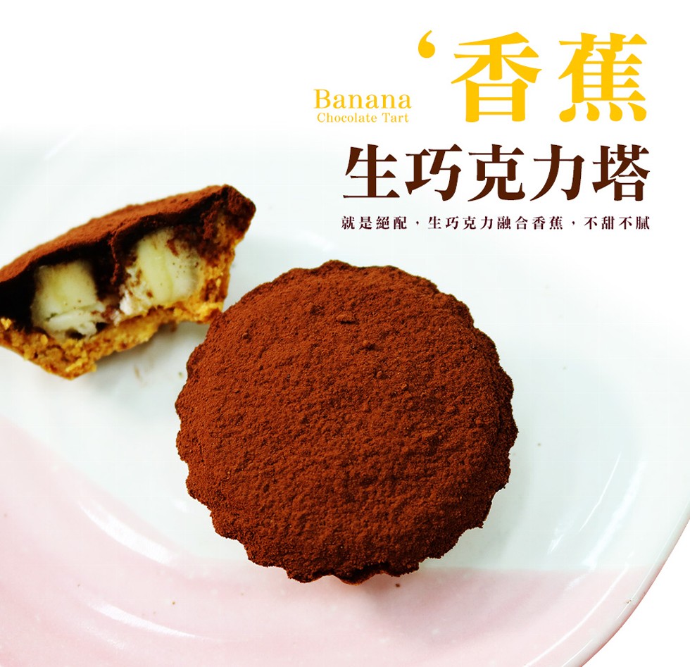 商品說明 產品名稱:香蕉生巧克力塔(單顆)規 格:30g±9%/入製造日期:接單後生產保存期限:需冷藏於2-4°C以下一週成 份:黑巧克力、香蕉、鮮奶油、奶油、麵粉、蛋、奶粉、糖產品特色:選用每日市場親挑、台灣在地新鮮香蕉,配上進口頂級72%比利時黑巧克力,打造絕妙滋味!外層撒上進口無糖可可粉,苦甜不膩口,大人小孩都喜歡!