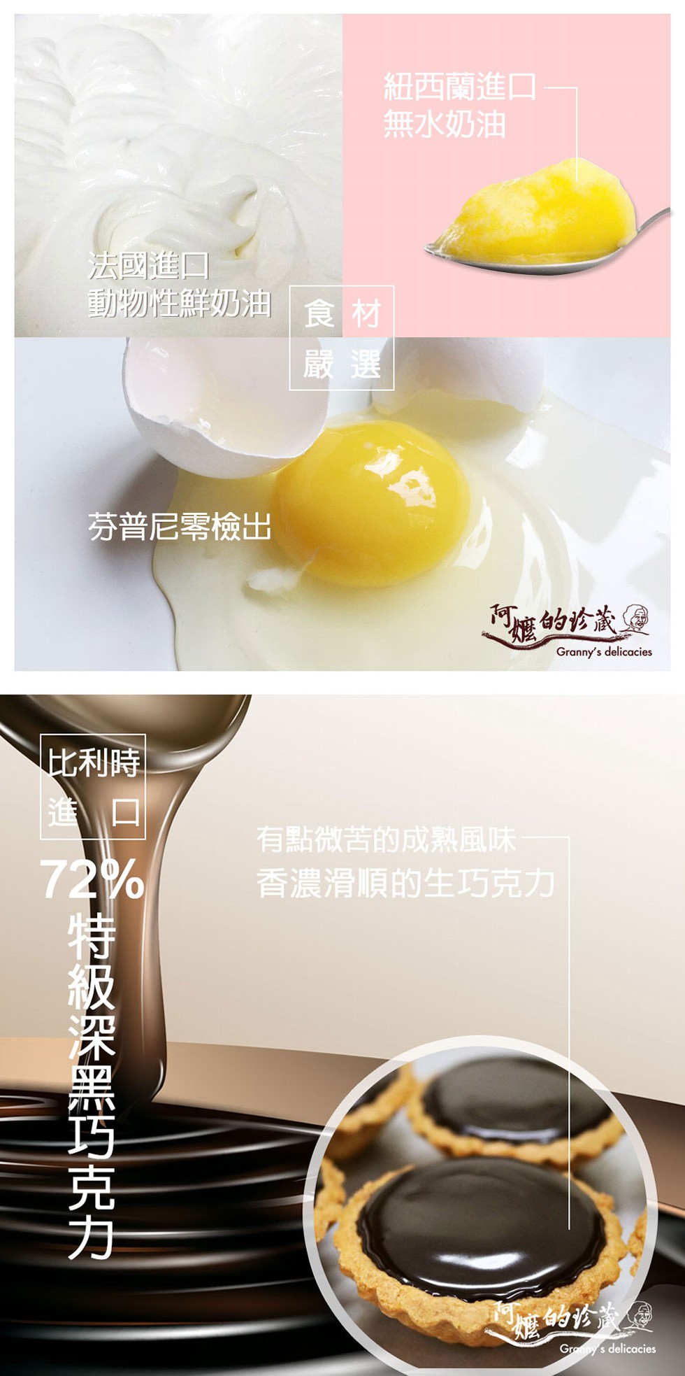 本店其他商品 查看全部 【阿嬤的珍藏】十勝乳酪塔(單顆) 原價$49 $44 售出270份 【阿嬤的珍藏】靜岡抹茶紅豆塔(單顆) 原價$39 $33 售出61份 【阿嬤的珍藏】蔓越莓乳酪塔(單顆) 原價$39 $33 售出418份 【阿嬤的珍藏】火山豆生巧克力塔(單顆) 原價$39 $33 售出83份 【阿嬤的珍藏】檸檬乳酪塔(單顆) 原價$39 $33 售出782份 【阿嬤的珍藏】花生醬巧克力塔(單顆) 原價$39 $33 售出46份 【阿嬤的珍藏】生巧克力塔(Mini Tart)(單顆) 原價$39 $33 售出823份 [滿額禮] 單筆訂單金額滿5000元,送生巧克力塔6顆 原價$234 $0 售出14份 [滿額禮] 單筆訂單金額滿2500元,送生巧克力塔2顆 原價$72 $0 售出4份